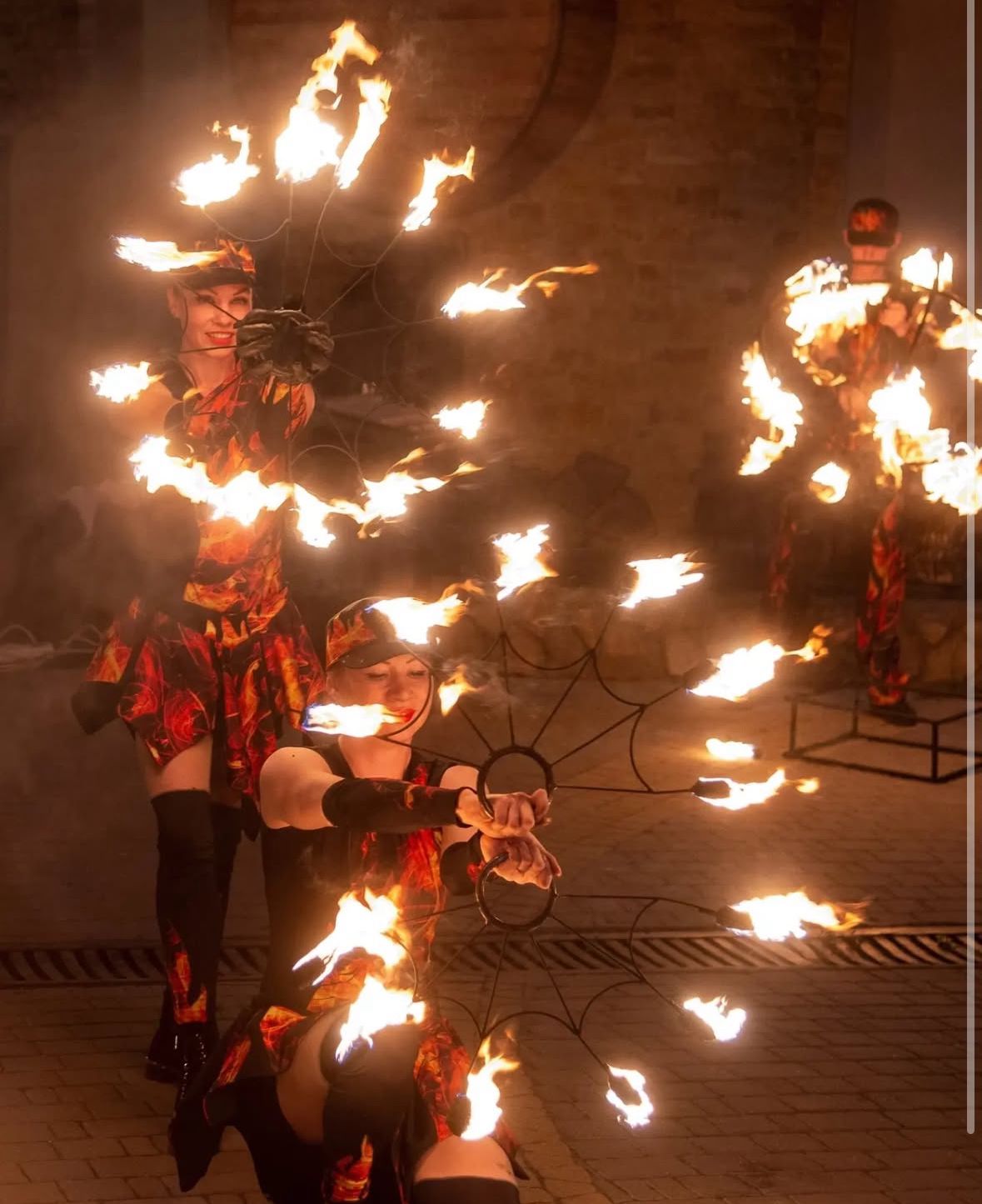 Multiple professional fire performers with coordinated routines